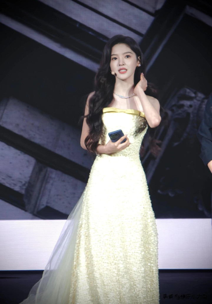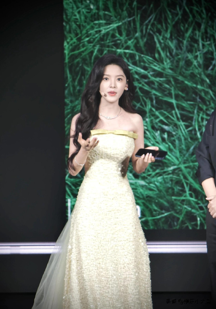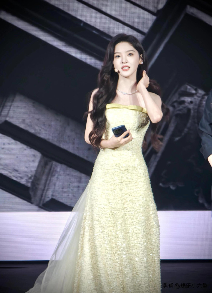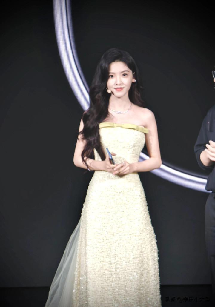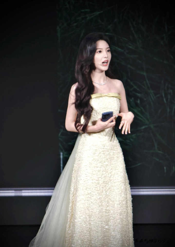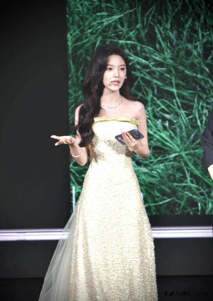 章若楠今日真我GT8Pro 手机发布会, 鹅黄色亮片抹胸礼服薄纱裙好美