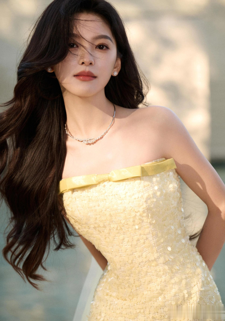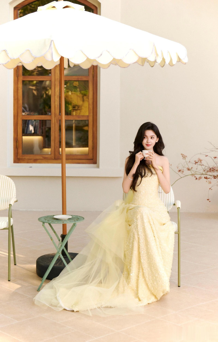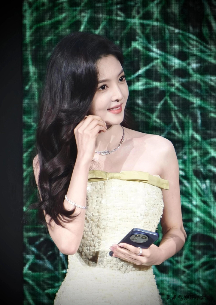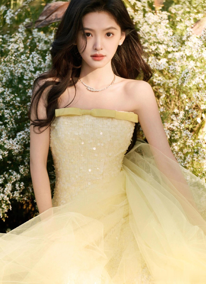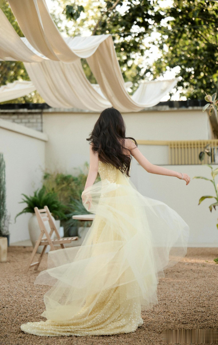 章若楠今日真我GT8Pro 手机发布会, 鹅黄色亮片抹胸礼服薄纱裙好美