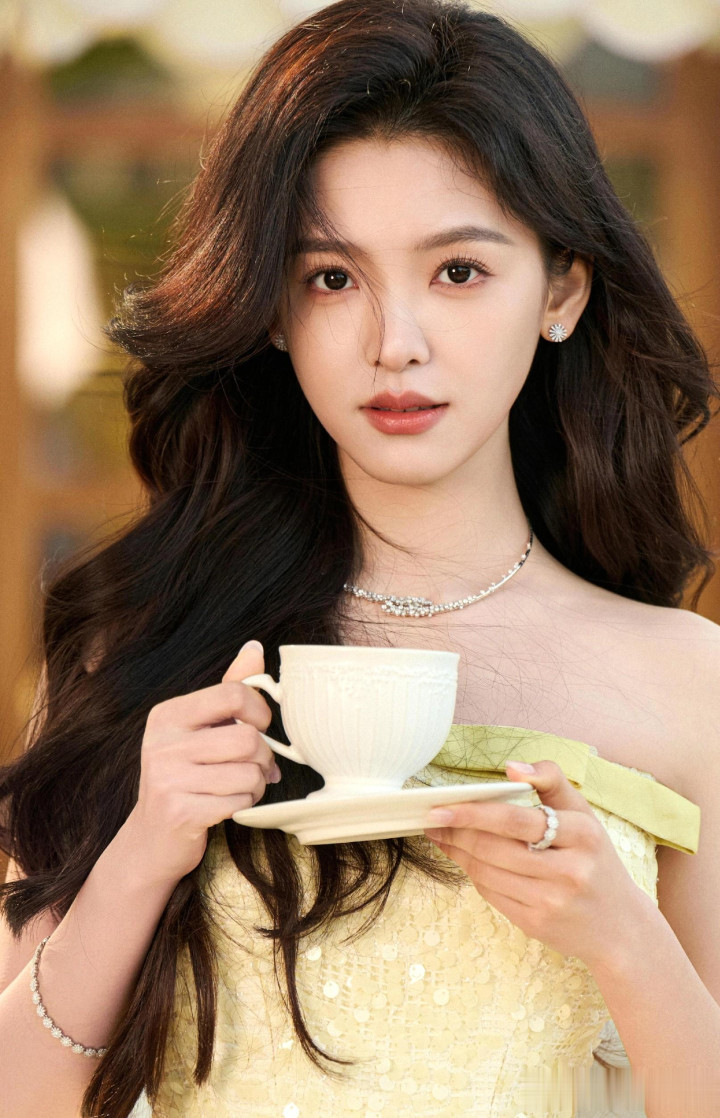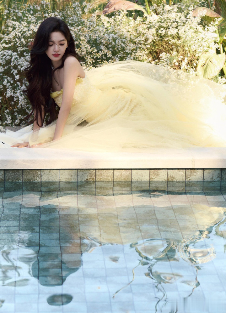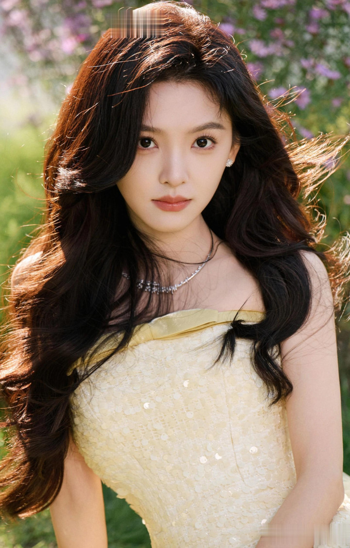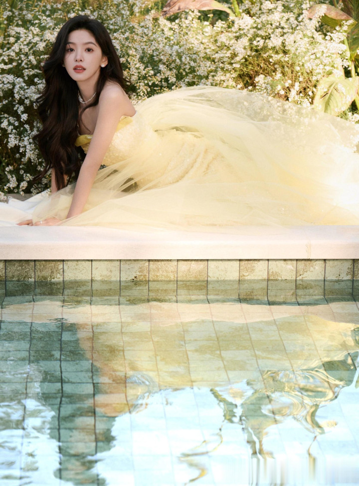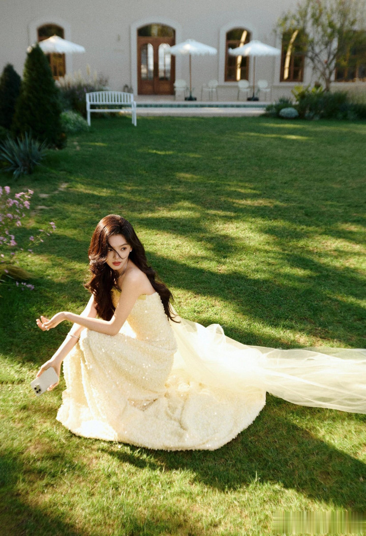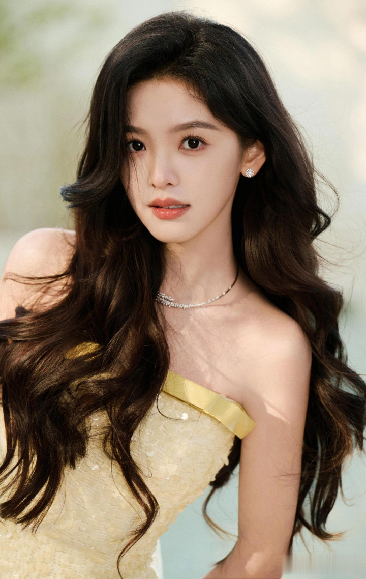 章若楠今日真我GT8Pro 手机发布会, 鹅黄色亮片抹胸礼服薄纱裙好美